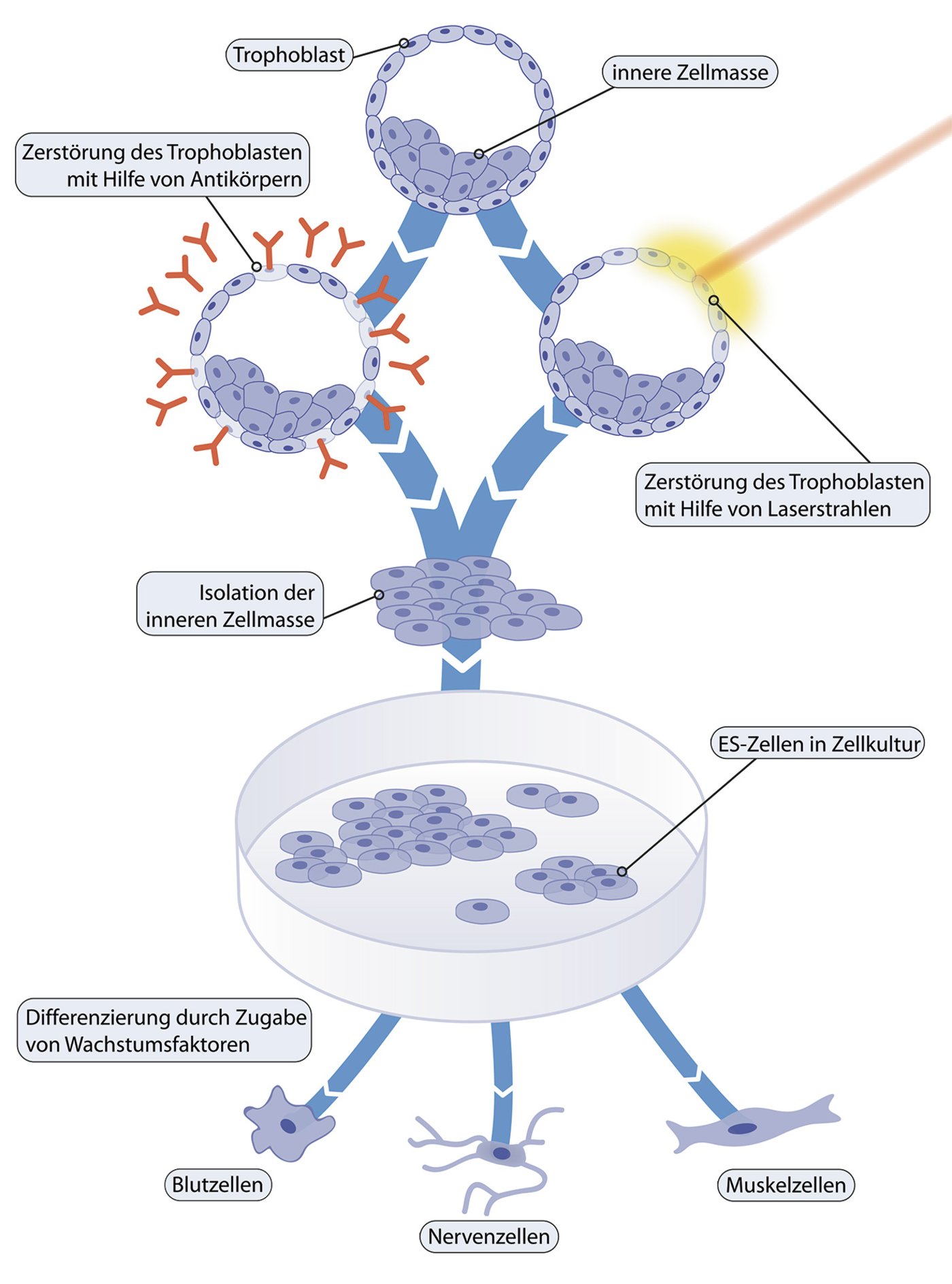 In order to obtain embryonic stem cells, the outer cell layer of the blastocyst must be destroyed so that the remaining cells of the inner cell mass (embryoblast) can be isolated and converted into cell cultures in the laboratory (see Figure 2). This internal cell mass, i.e. the isolated cells, has the potential to develop under controlled conditions into any cell type of the human body, but the embryonic stem cells can no longer form a complete organism.